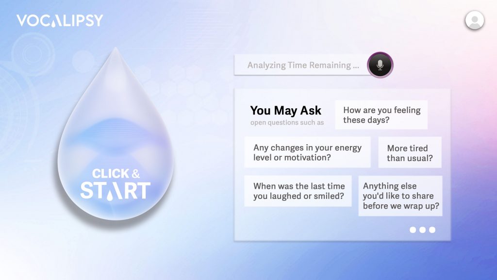 À l’ouverture, Vocalipsy propose une interface épurée et intuitive. L’utilisateur clique sur la goutte pour lancer l’analyse vocale. Des exemples de questions ouvertes sont affichés à l’écran pour guider l’échange avec le patient et favoriser un dialogue naturel. Cette étape marque le début du processus d’évaluation, sans nécessiter de formation préalable ni manipulation complexe.