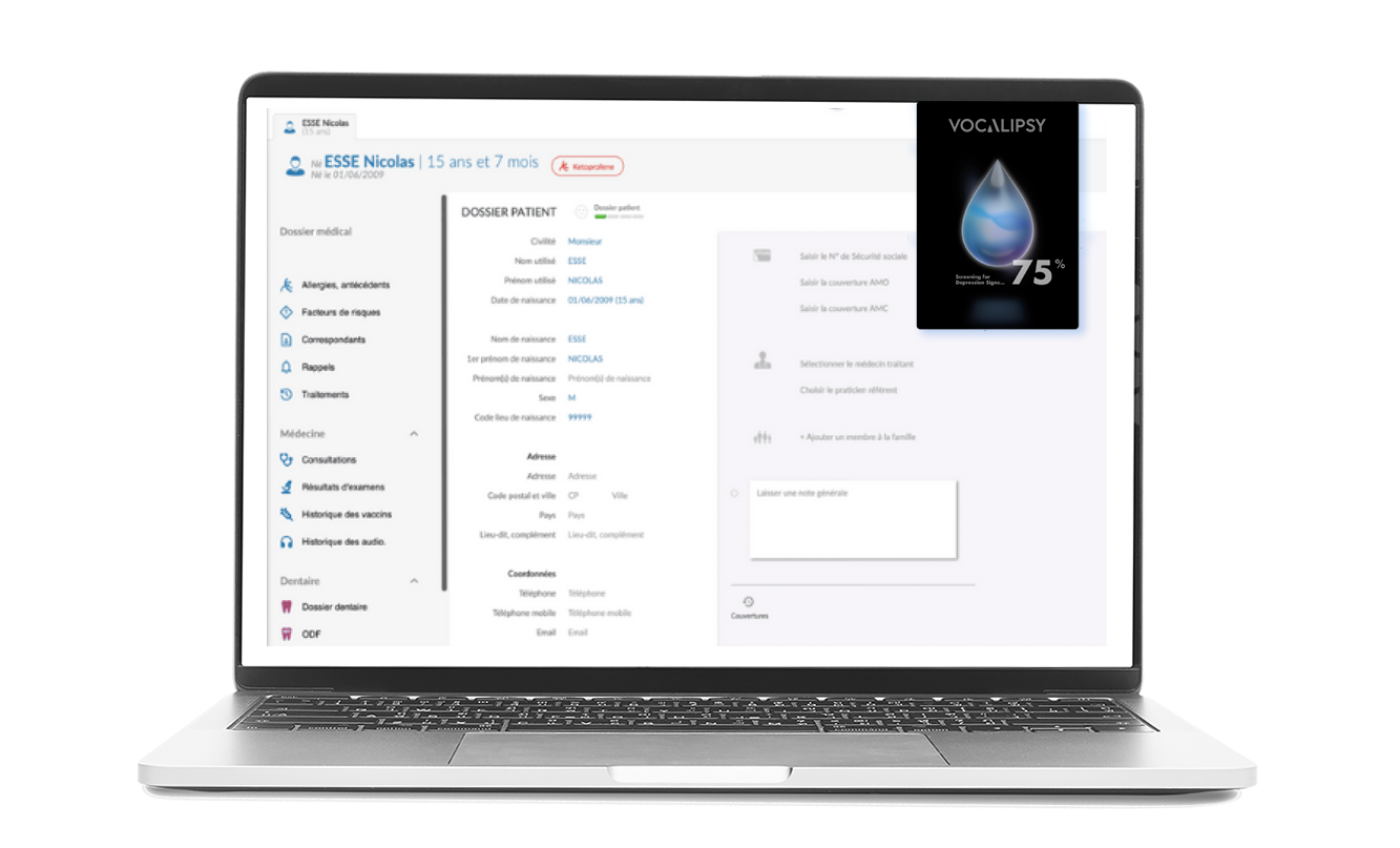 Une fois l’analyse achevée, le logiciel affiche un score indiquant le niveau de risque émotionnel détecté ainsi que des éléments d’interprétation précis et contextualisés pour aider le médecin à situer rapidement ce résultat dans sa démarche clinique.